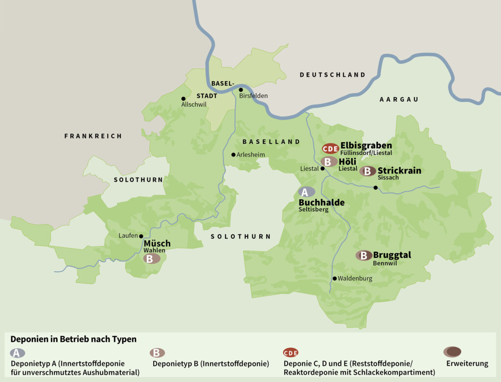 Die Kantone Basel-Landschaft und Basel-Stadt arbeiten in der Abfallbewirtschaftung eng zusammen. Da der kleinräumige Stadtkanton keine sinnvollen Deponieflächen bereitstellen kann, findet die Deponieplanung im Landkanton statt.